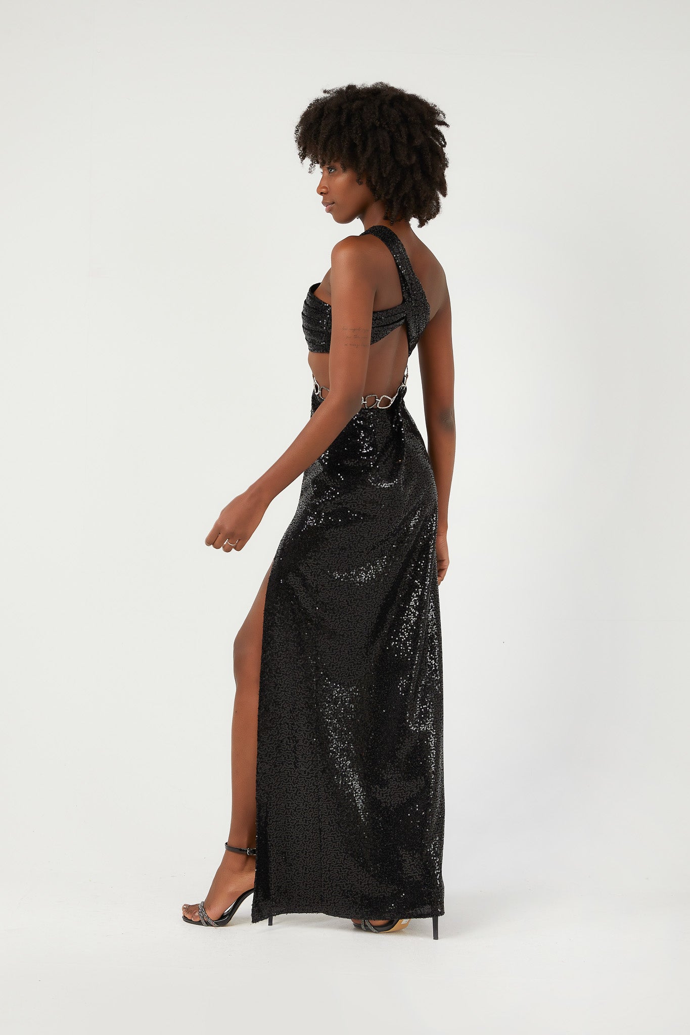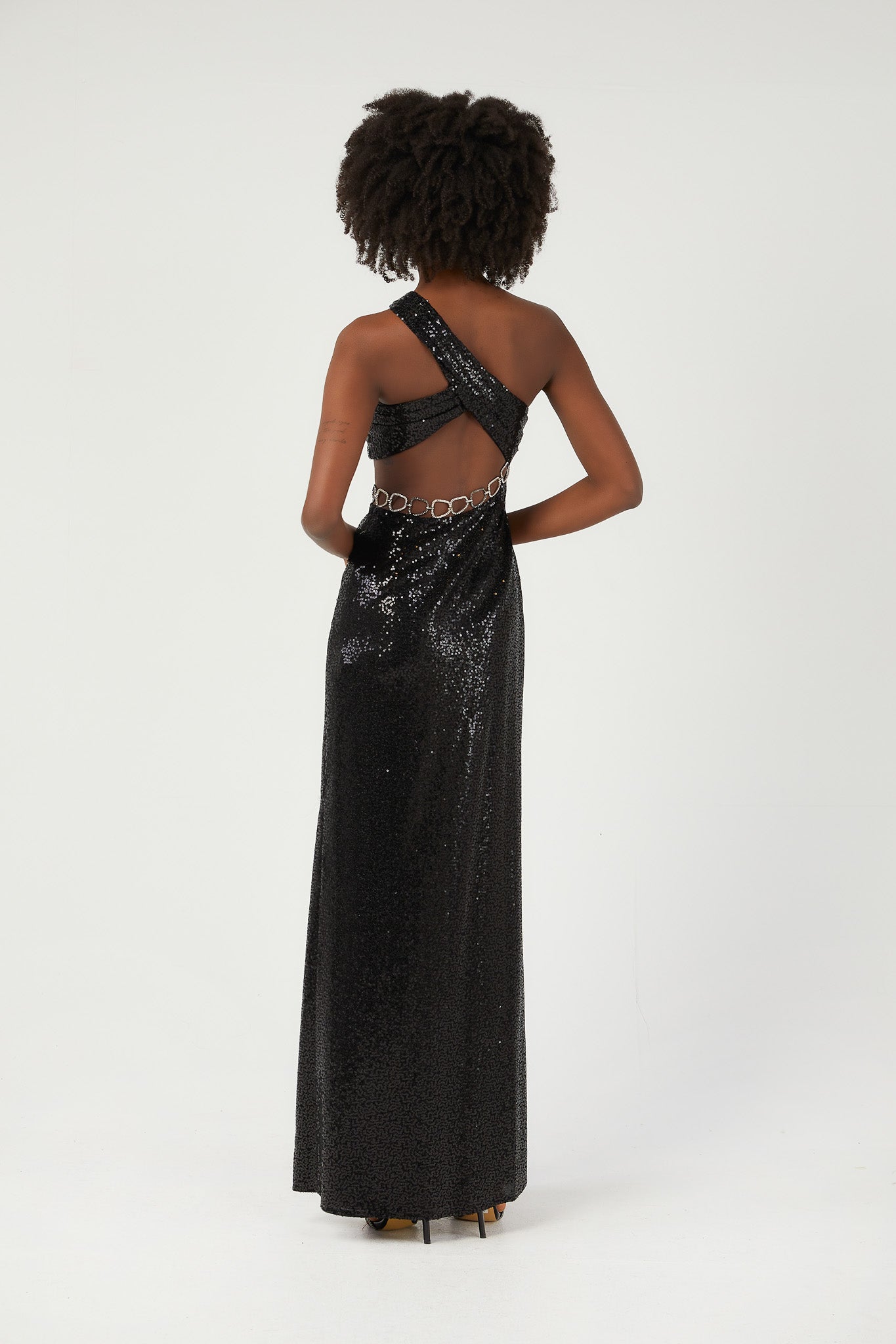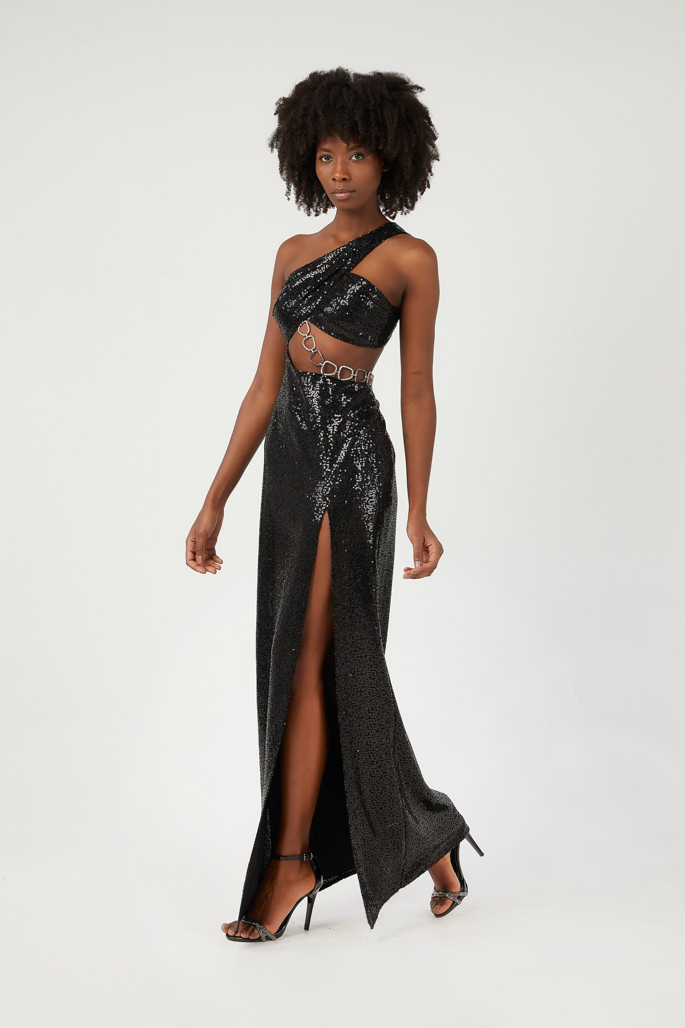 Beli zincir detaylı, yırtmaçlı payet elbise
