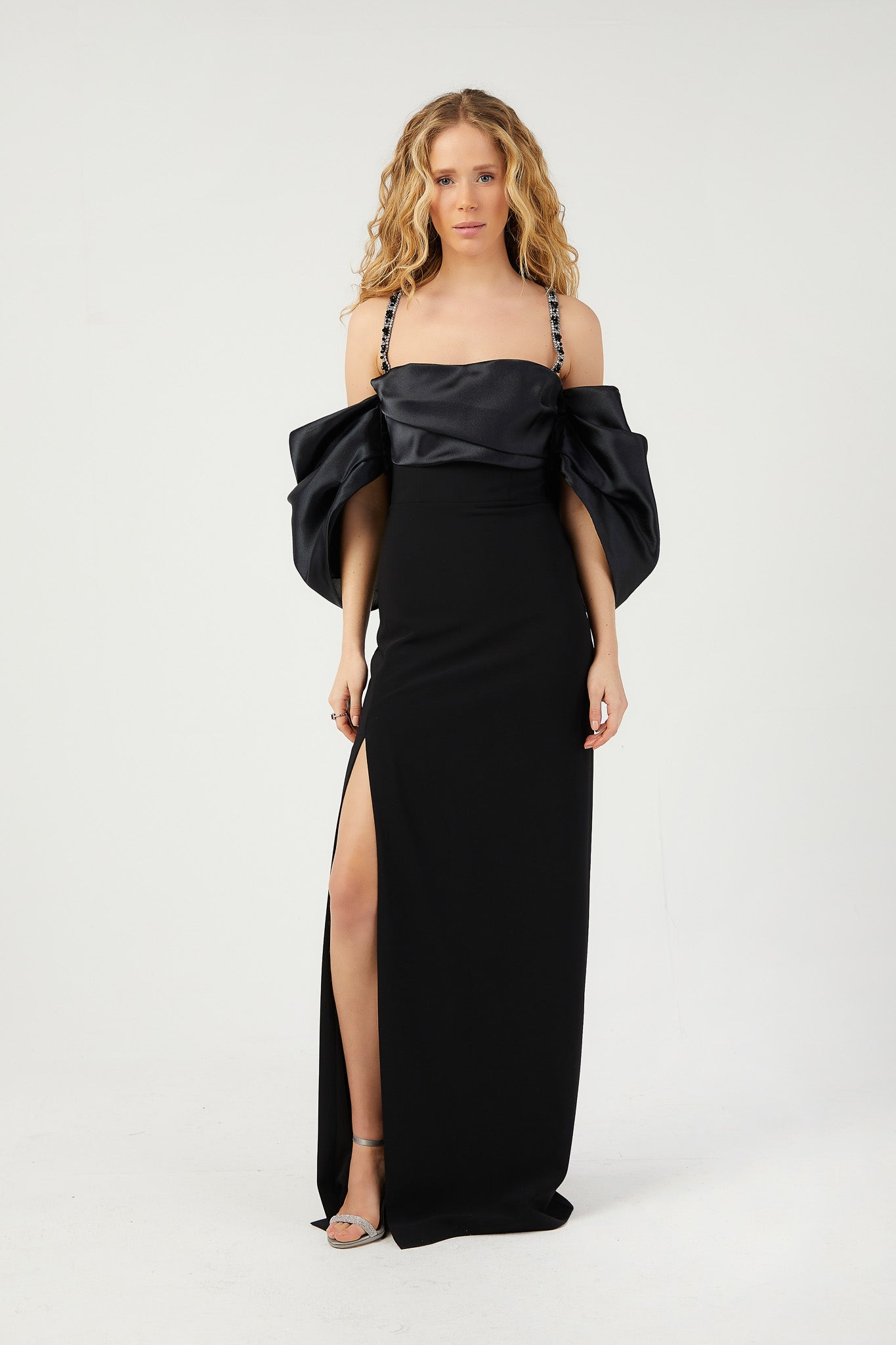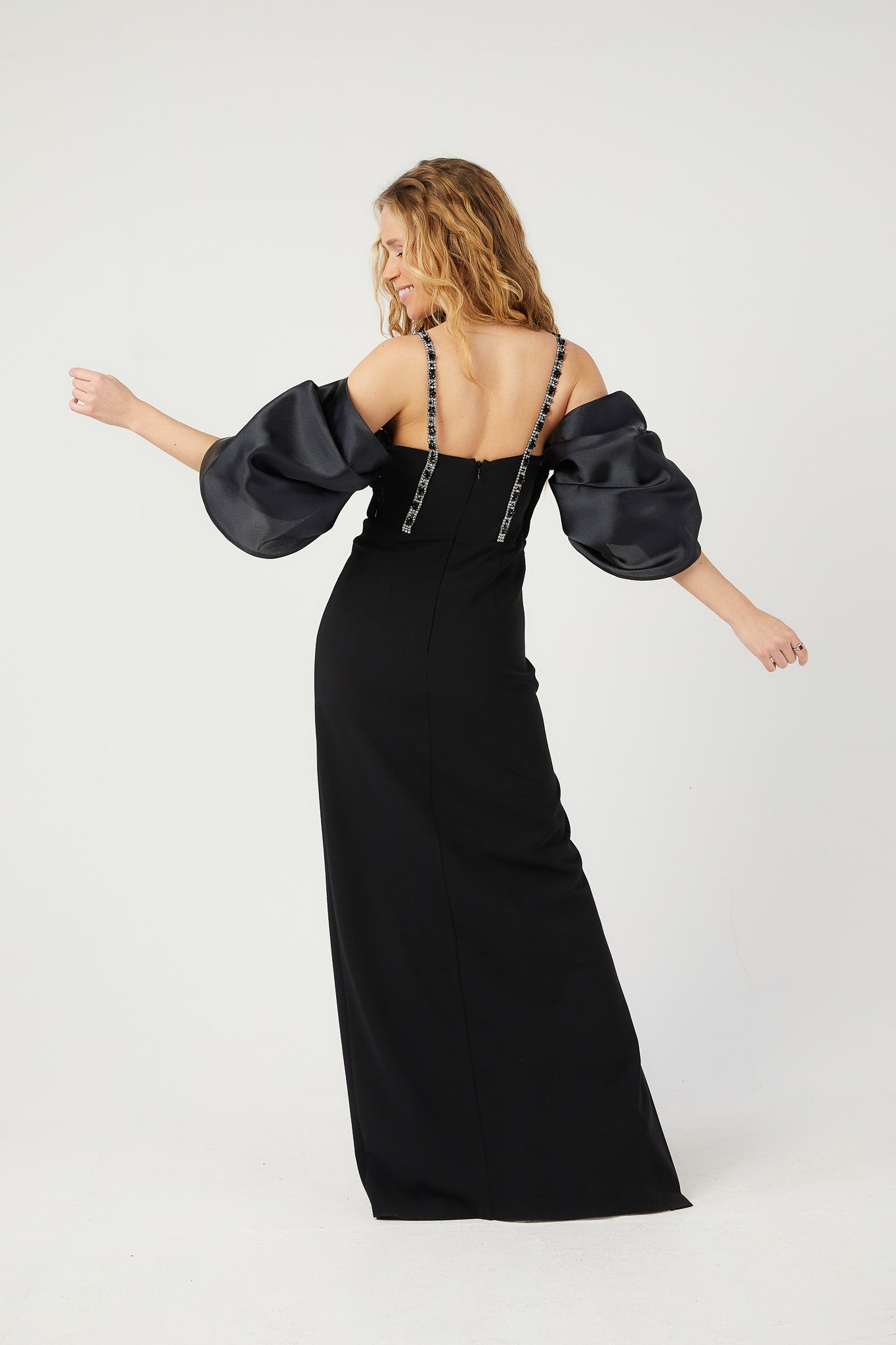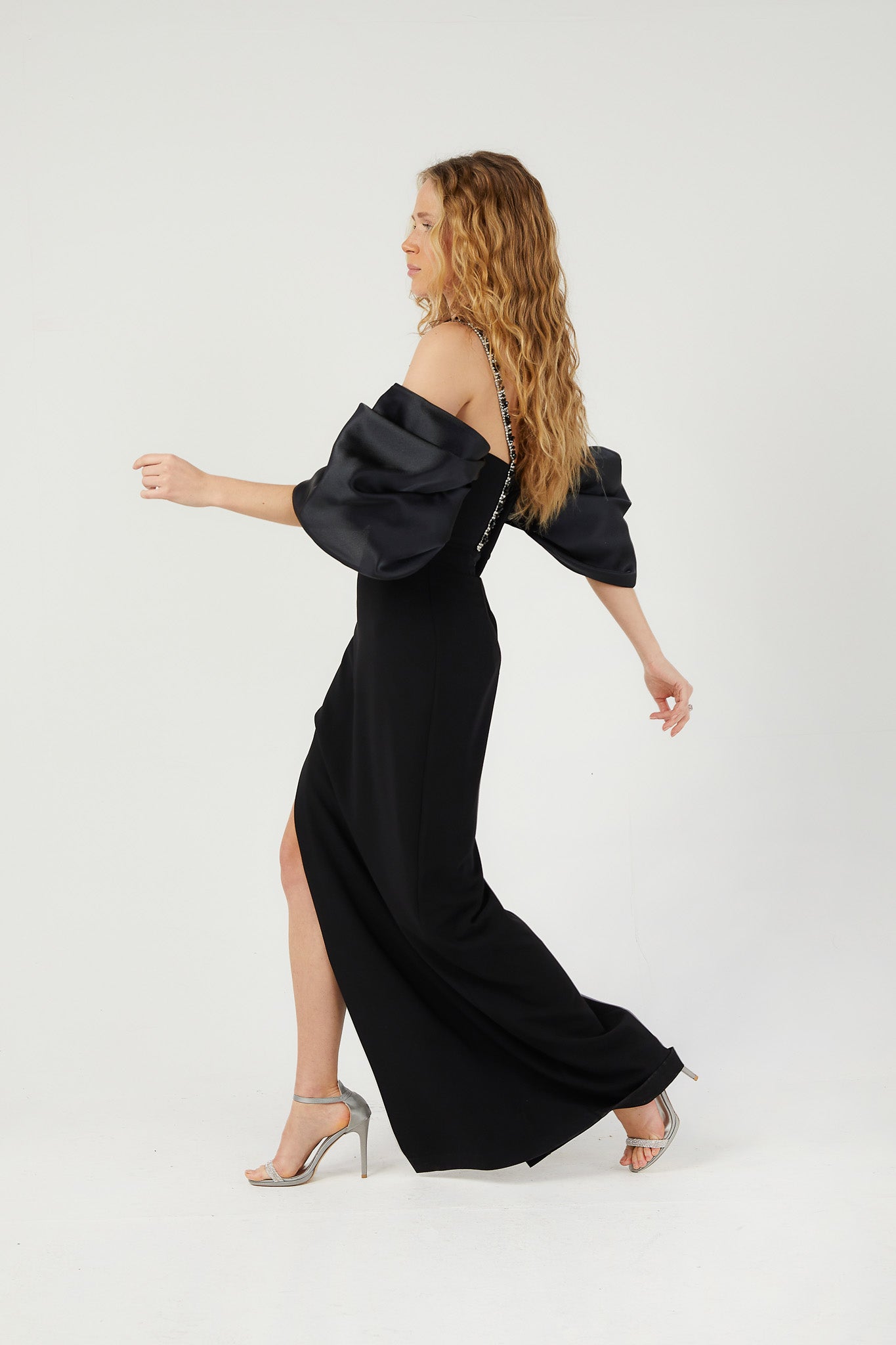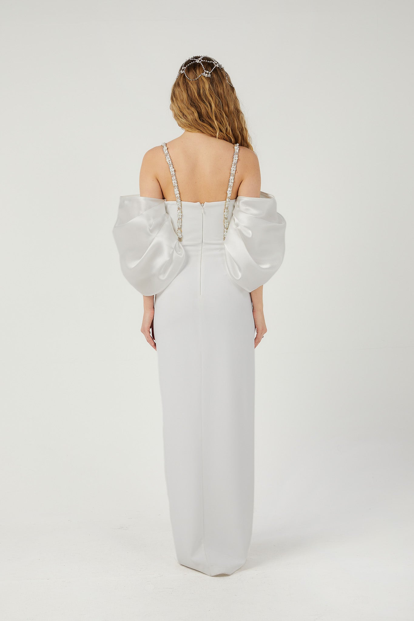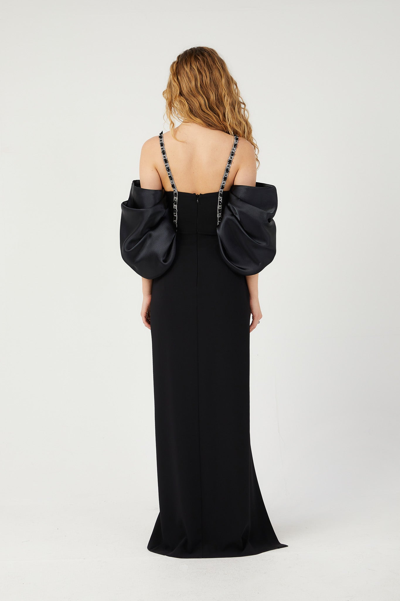 Askıları taş detaylı, düşük balon kollu, yırtmaçlı uzun elbise