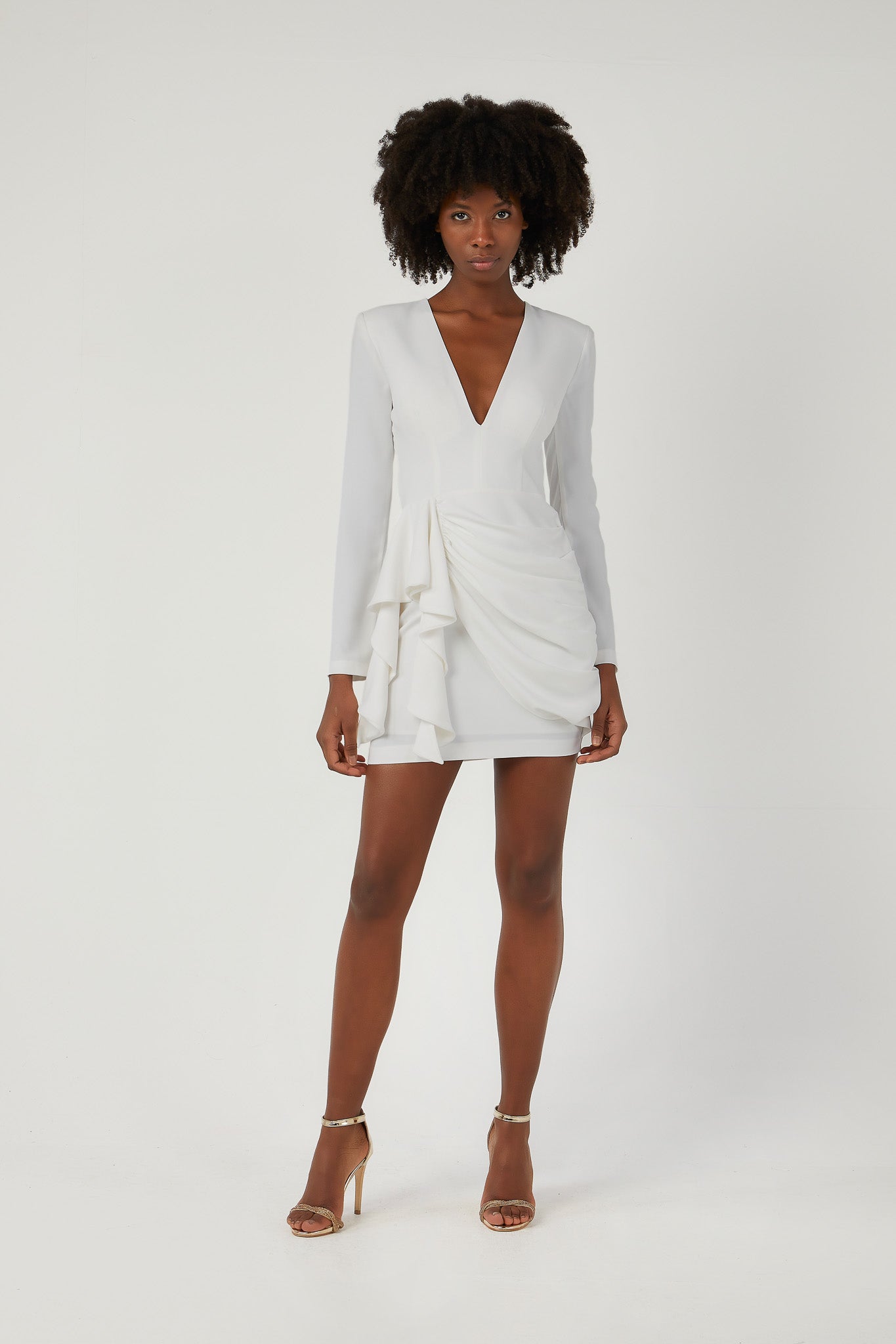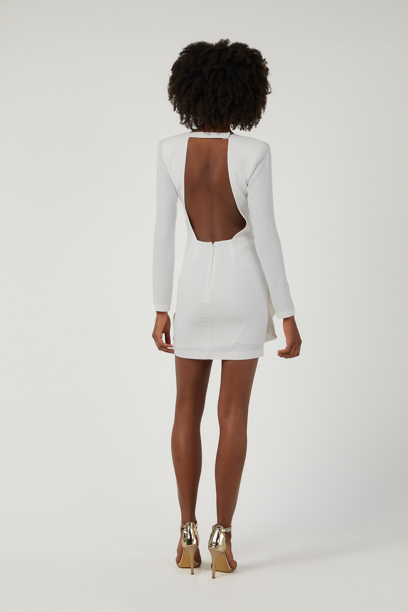Uzun kollu, sırtı açık, V yaka kısa elbise