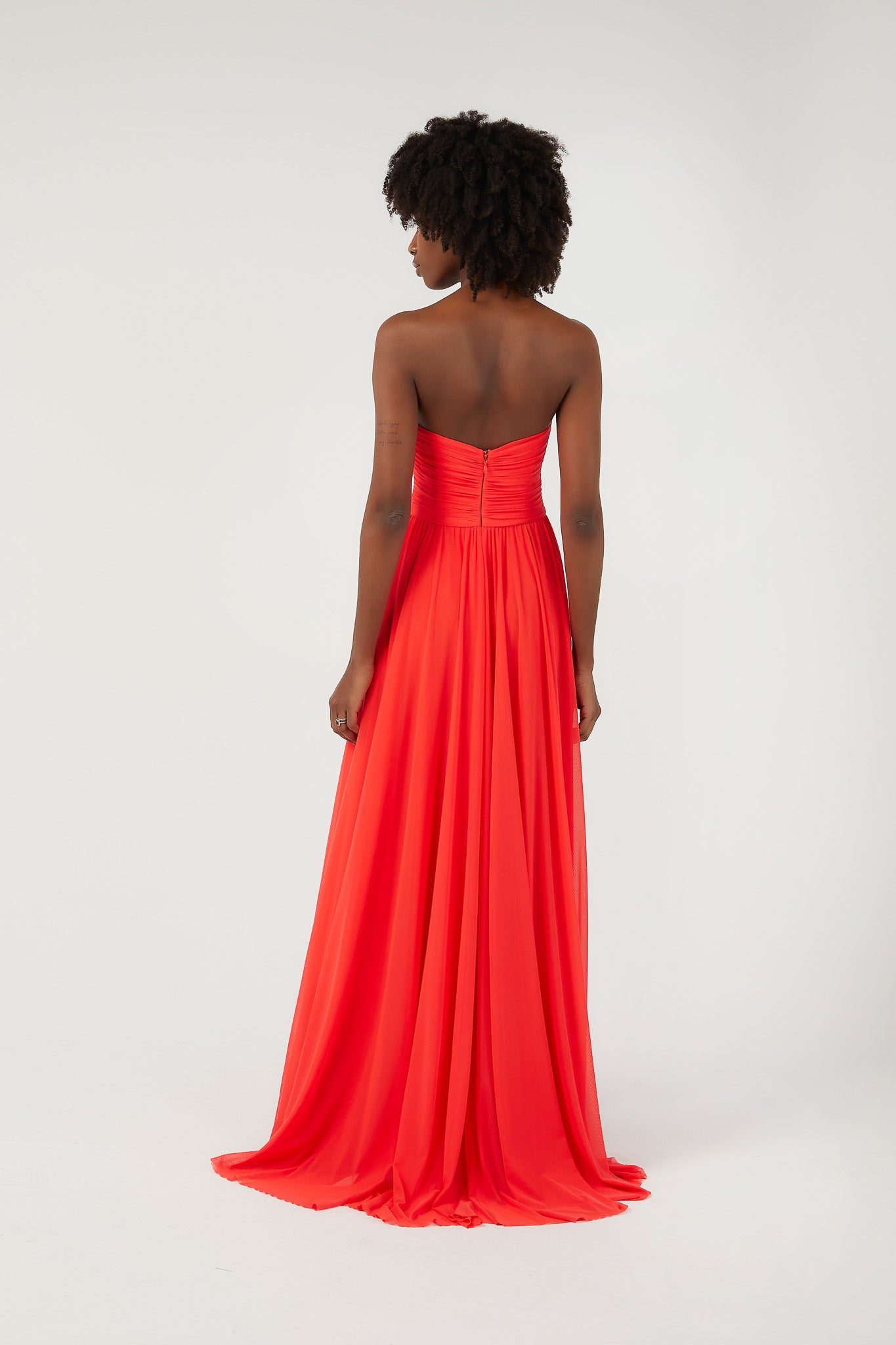 SİM Şifon Yırtmaçlı Straplez Elbise 7959