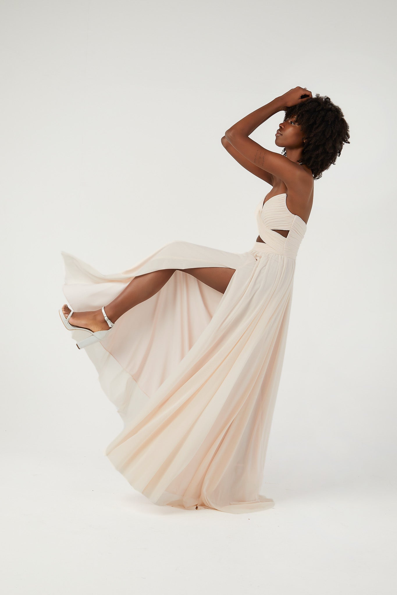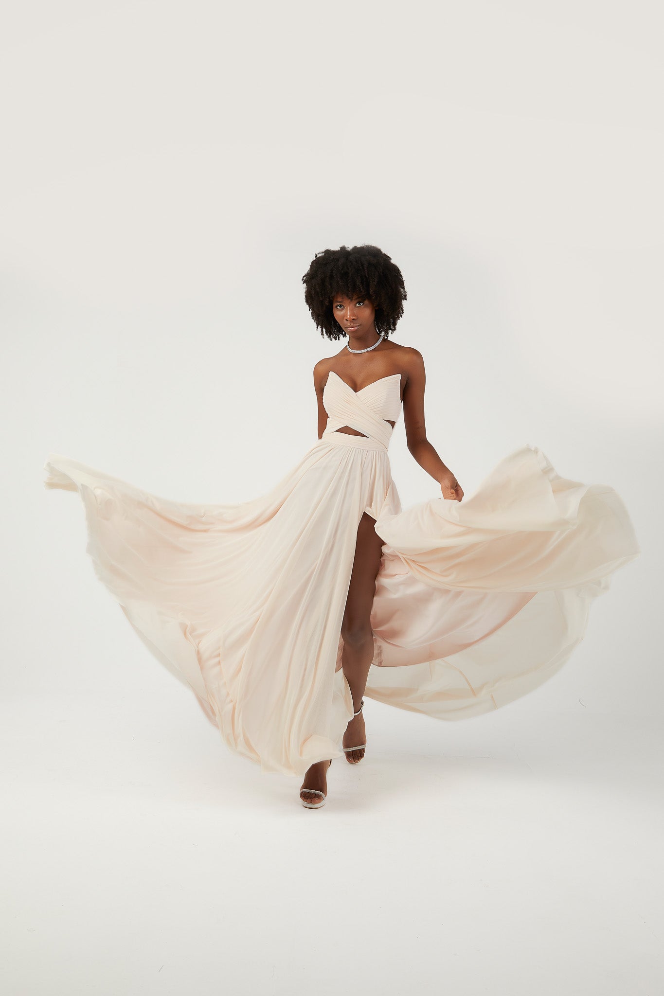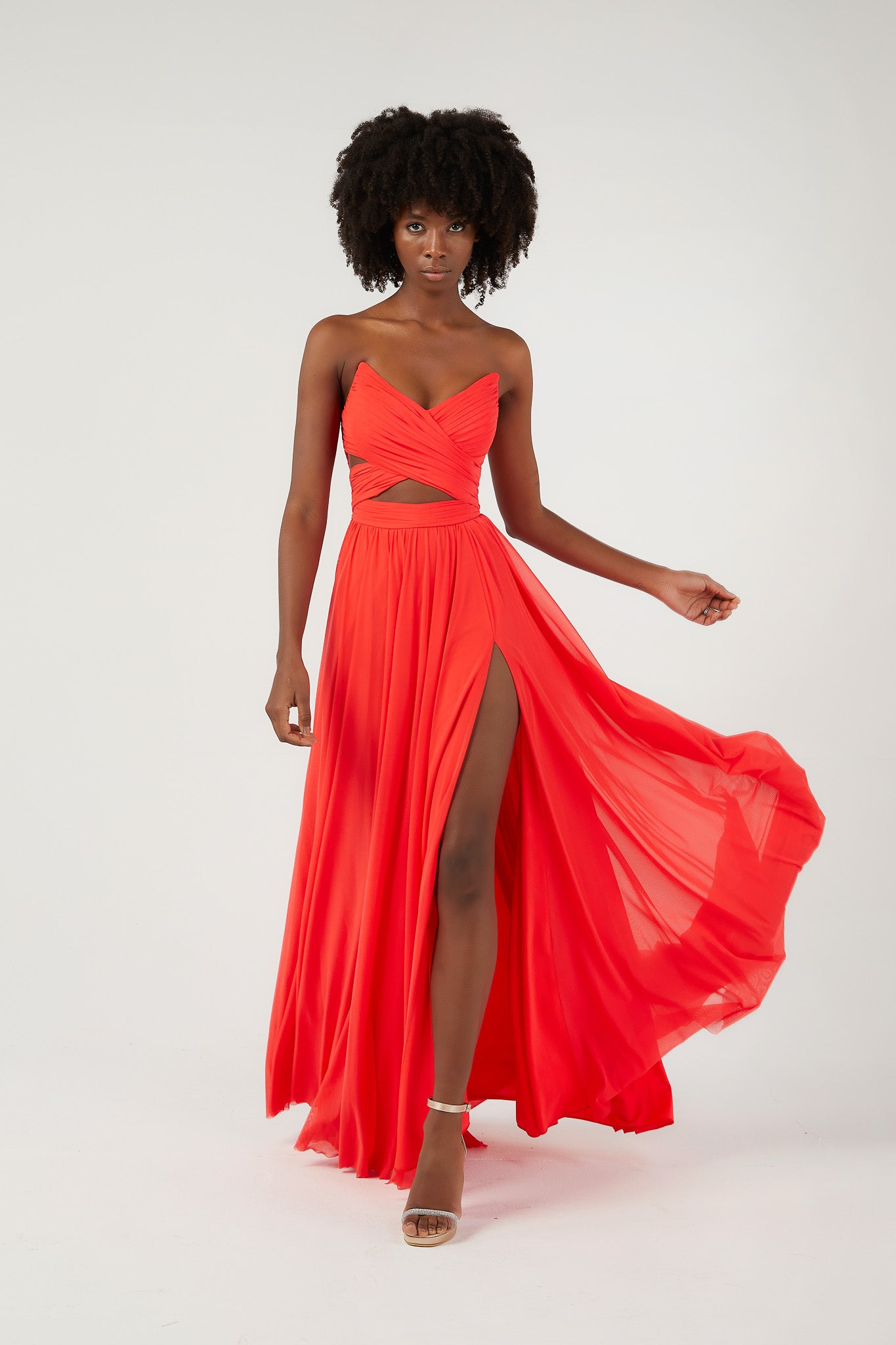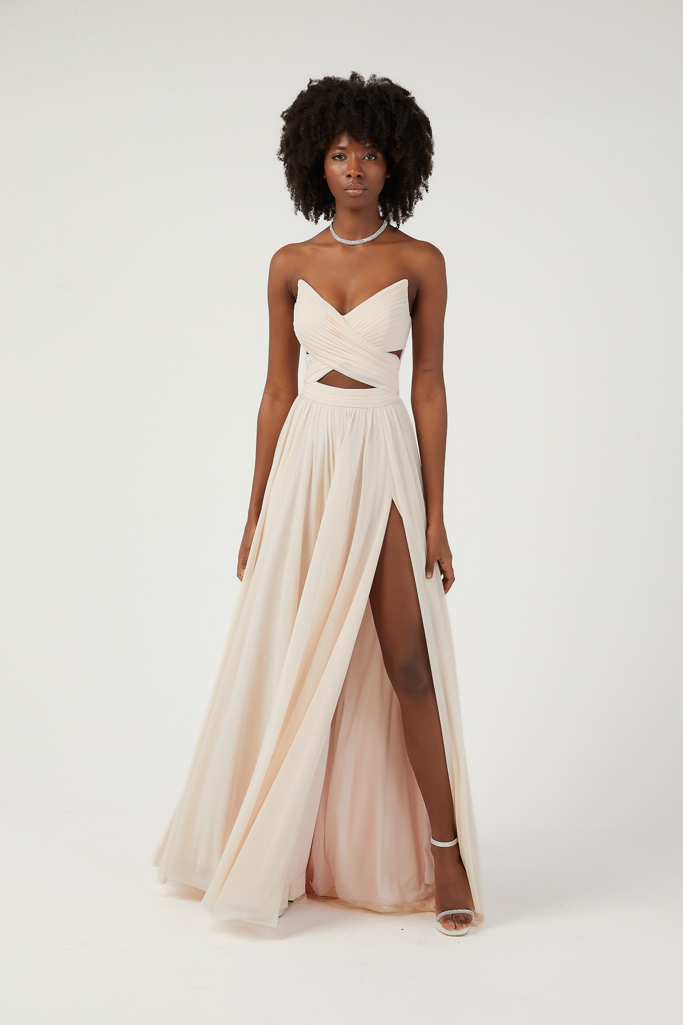 Pencere detaylı yırtmaçlı şifon straplez elbise