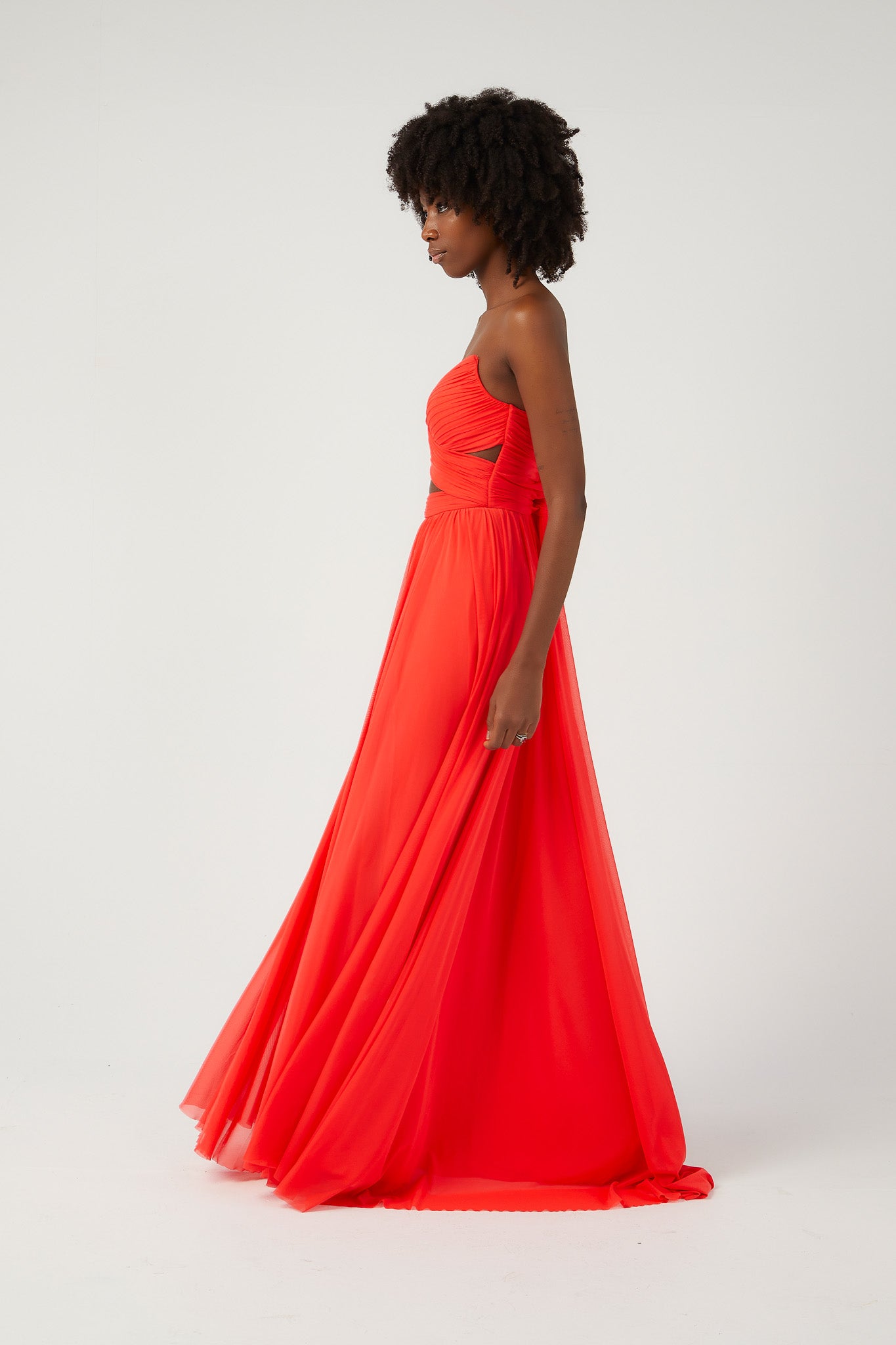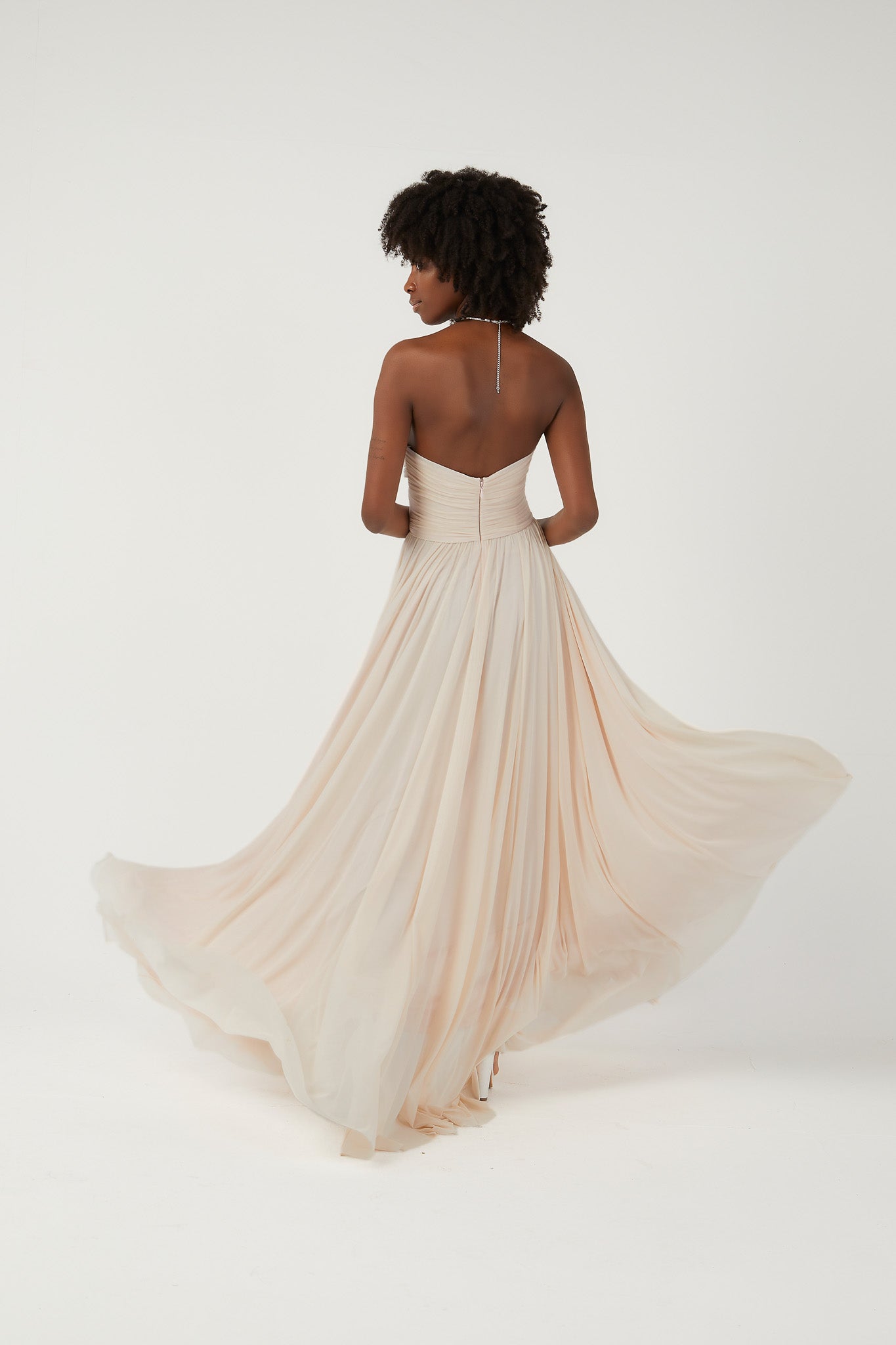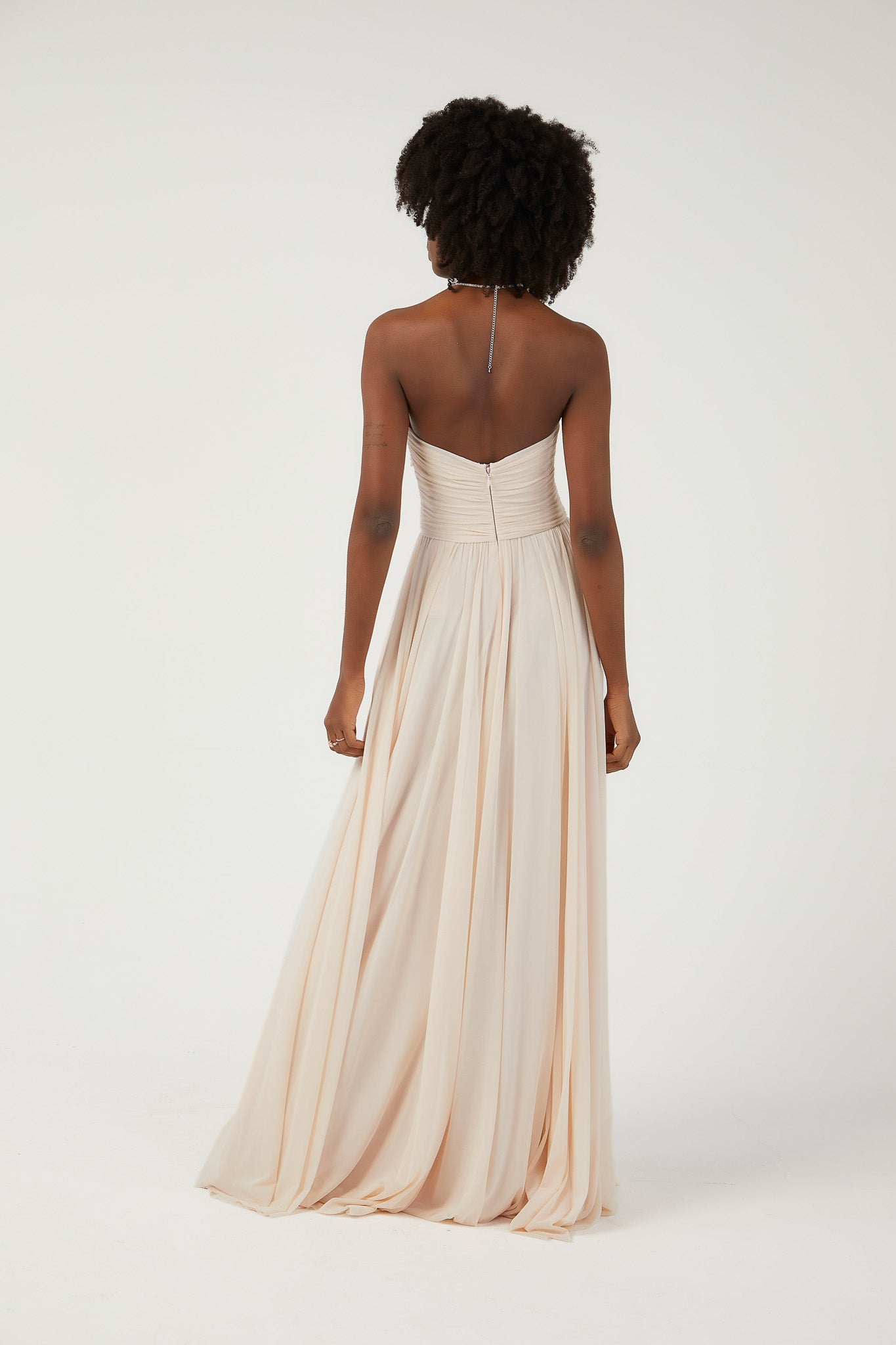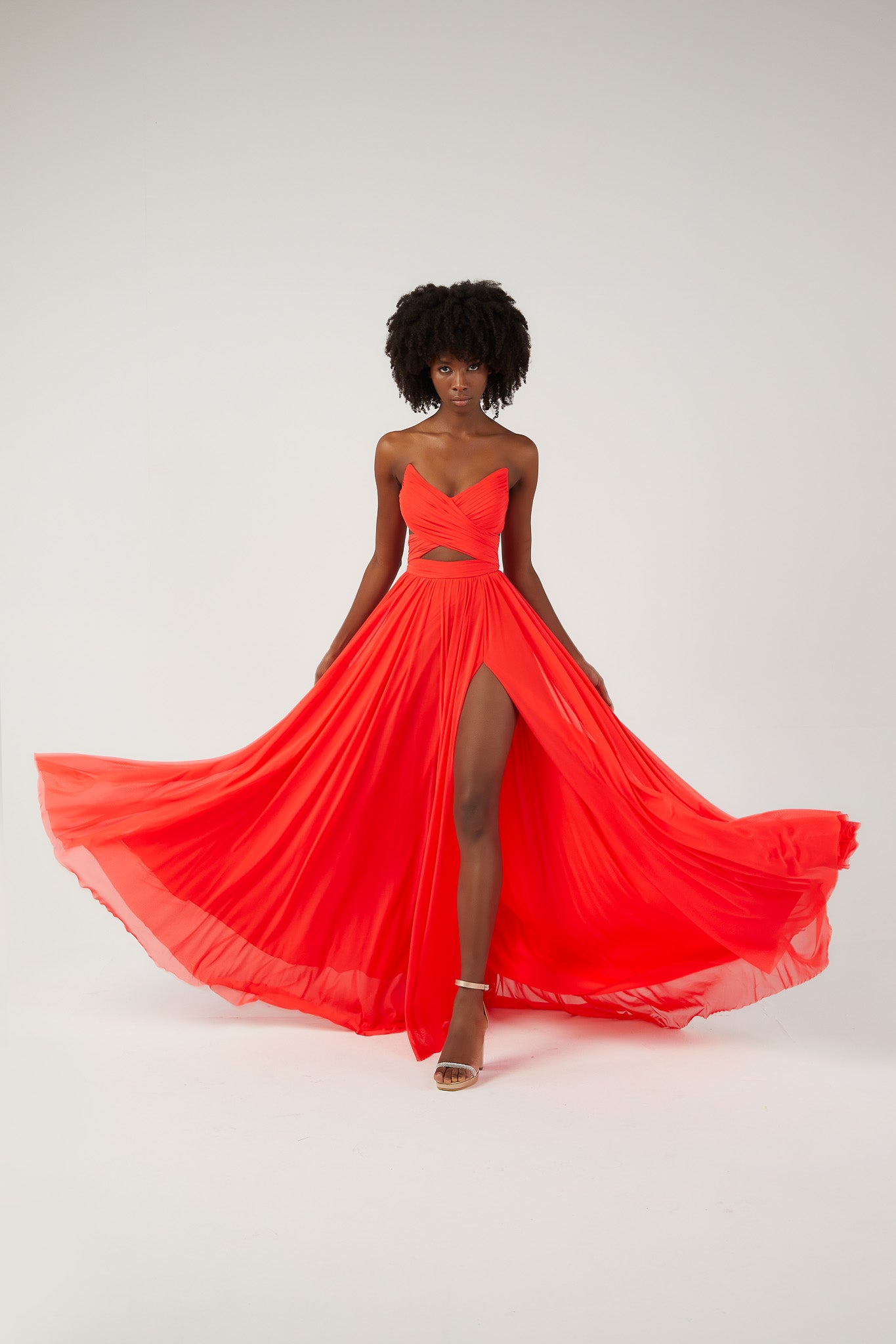 Pencere detaylı yırtmaçlı şifon straplez elbise